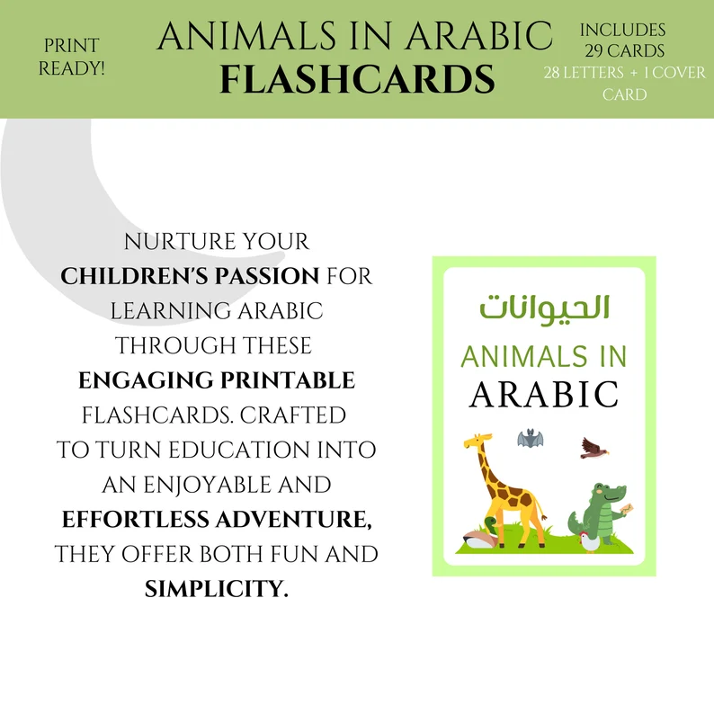 هذه المجموعة من الفلاش كاردز الملونة مصممة خصيصًا لمساعدة الأطفال على حفظ أسماء الحيوانات باللغة العربية بطريقة ممتعة وبصرية.